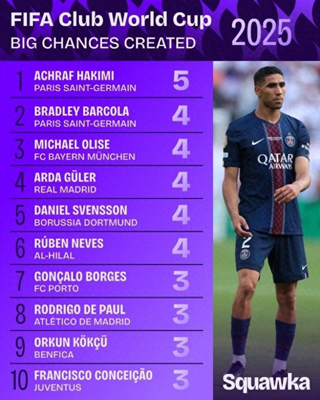 直播吧7月11日讯 本届世俱杯仅剩巴黎vs切尔西的决赛,数据机构squakwa也统计了本届赛事创造重大机会情况,边后卫阿什拉夫居首。