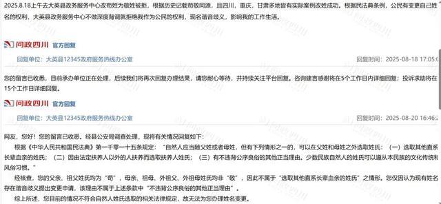 8月20日,大英县12345政府服务热线办公室回复该网友表示,根据《中华人民共和国民法典》第一千零一十五条规定:“自然人应当随父姓或者母姓,但有下列情形之一的,可以在父姓和母姓之外选取姓氏:(一)选取其他直系长辈血亲的姓氏;(二)因由法定扶养人以外的人扶养而选取扶养人姓氏;(三)有不违背公序良俗的其他正当理由。少数民族自然人的姓氏可以遵从本民族的文化传统和风俗习惯。”